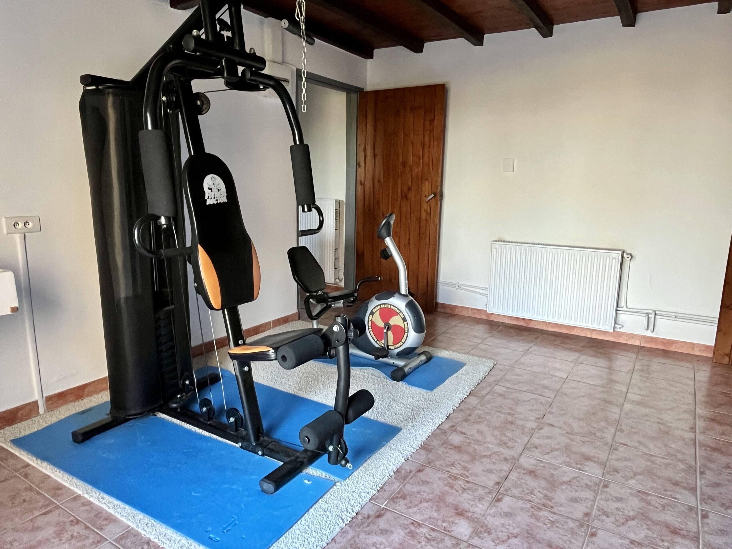 On the ground floor you have a 2nd bathroom with shower and bathtub. The downstairs toilet is separate. You will also find a spacious kitchen and a separate dining room with a 3-meter long dining table. The salon has a beautiful fireplace and 2 sofas, a flat screen TV with home cinema. There is also a small sports hall on the ground floor with sports equipment. As an extra, the house has 2 large garages where you will find the sauna and a ping-pong table.